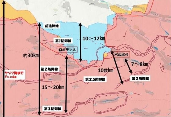 ロシア軍が占拠する地域は、南北に幅約110キロあるが、防御陣地はその北部の約30キロに集中している。