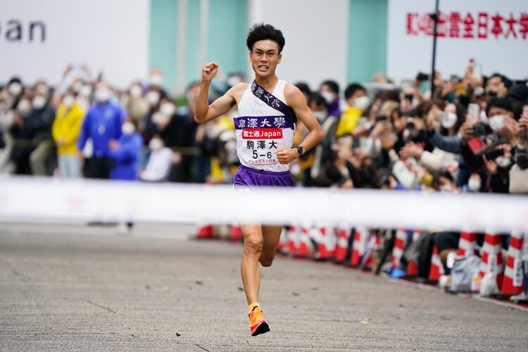 2022年10月10日、出雲駅伝6区を走り、ゴールする鈴木芽吹(駒大) 写真=SportsPressJP/アフロ