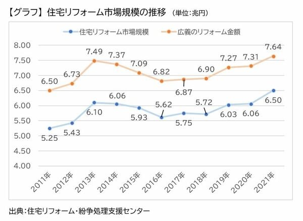 通常のリフォームにエアコンや家具などリフォームに関連する消費財、インテリア商品などを加えた広義のリフォーム市場も拡大している。2020年の7.31兆円が、2021年には7.64兆円になっている。