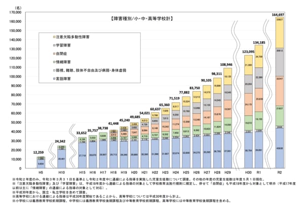 文科省による2020年の別の調査*2では、注意欠如・多動症(ADHD)、自閉スペクトラム症 (ASD) 、学習障害(LD)など、総称として発達障害と呼ばれる障害を持ち、特別支援学級に通っている小中高生の数は16万4697人。この数字も過去最多であり、前年より3万512人増えている(注:この数字には難聴や肢体不自由、病弱の生徒数も含まれている)。