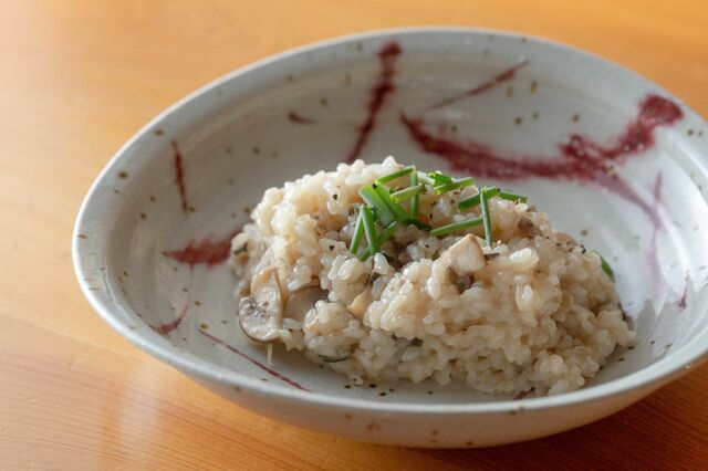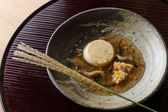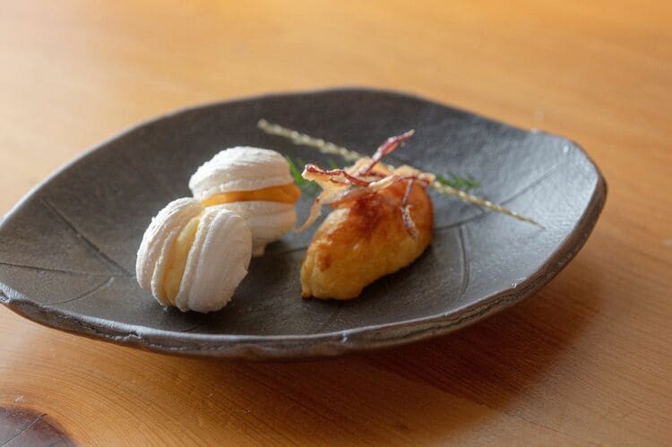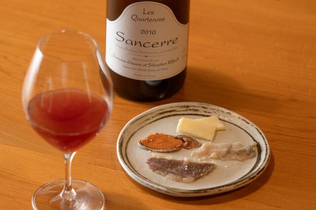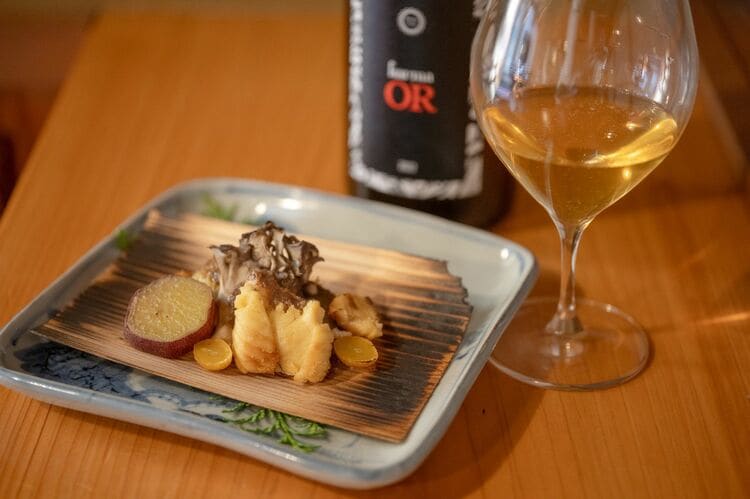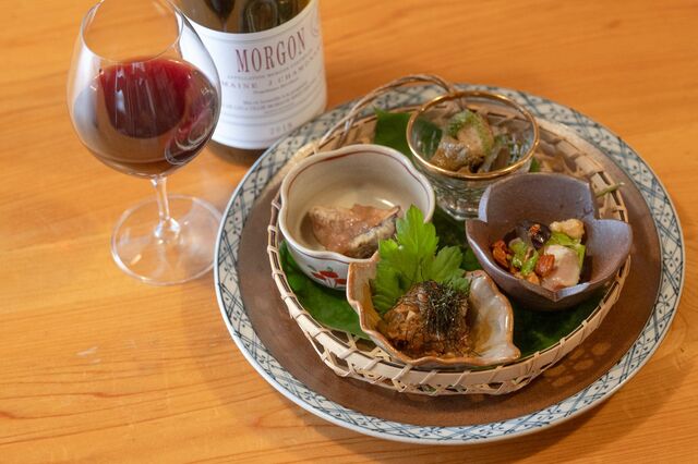 彩りはまさに京料理風だが、材料の魚介はすべて琵琶湖の幸だ。合わせたワインはダニエーレ・ピッチニン『ビアンコ・デイ・ムーニ 』(2021年 白 イタリア ヴェネト)。どこか日本酒を彷彿させる旨みの強い白が、「和食との距離が近くなるように」という佐々木さんの狙いにピタリとはまる。