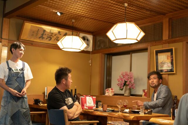 この会は、滋賀県漁業協同組合連合会青壮年部の会長を務め、自身も堅田漁港の漁師である、横江拓郎さんが、石山寺の門前にある、しじみ飯の有名店で、近年、うなぎや湖魚メニューに力を入れている「湖舟」の井上水晴(みはる)さんに依頼したもの。ほかのゲストも、琵琶湖で操業する若手の漁師と養殖家という、湖魚を熟知する面々。ワインのセレクトは、滋賀県守山市のナチュラルワインの専門店AZURE BLUEの佐々木祐哉さんが担当した。