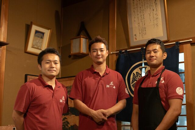 井上水晴さん(中央)、菊乃井時代の同僚だった飯野陸さん(左)、大門祐次さん(右)が一緒に厨房に立ち、湖魚料理を開拓する