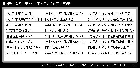 25日に米商務省が発表した米2月の新築住宅販売は年率33万7000戸(前月比+4.7%)。減少を予想していた市場の見方に反し、7カ月ぶりに増加に転じた。米国の住宅関連指標にはこのところ改善するものが目立つようになっており、米住宅市場が最悪期を脱しつつあるのではないかという見方が浮上してきている。