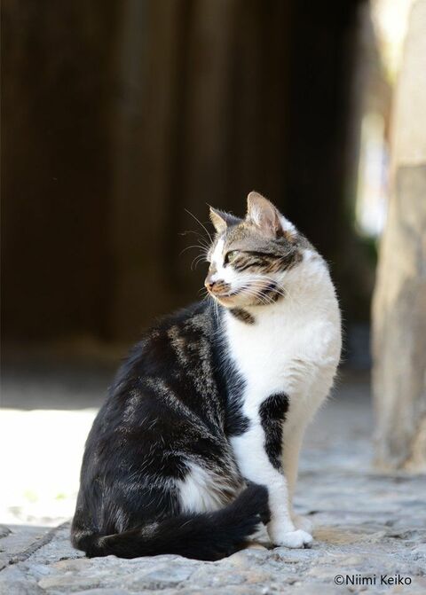 猫がこちらに向き直ると、とても愛嬌のある柄をしていました。切れ長の印象的な大きな目をしています。教養がある猫のように見えました。