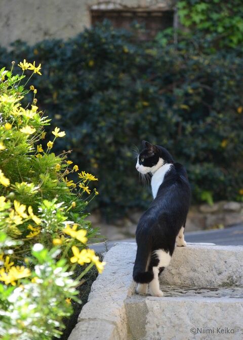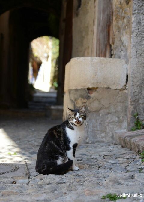 すると、続く階段の下にも振り向いている猫がいました。誰か人を待っているのか、友だち猫を待っているのか…。気がつくと、ここまで案内してくれた白黒猫は、姿が見えなくなっていました。