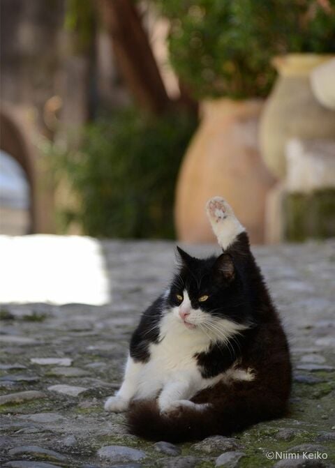 カーニュシュルメール村の猫たちはみんな、知り合いの人や猫を待っているような雰囲気を漂わせています。この猫も、毛繕いをしながら、ときどき遠いところに視線を送っていました。