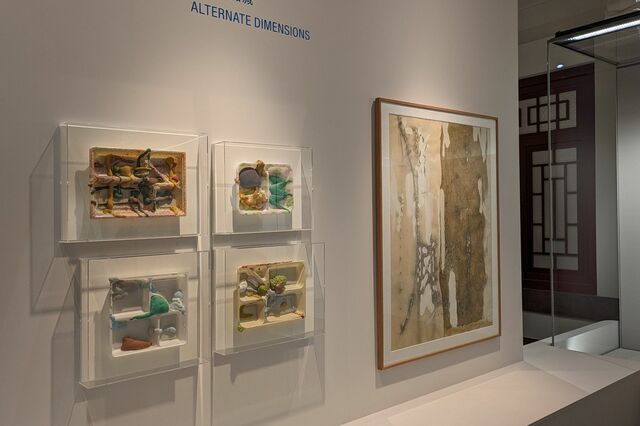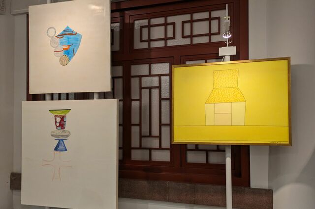 左上はO JUN『水金地火木』(2019)、左下も同じくO JUNで『食器・金星』(2010)、右が岡本信治郎『愚人の家』(1967)