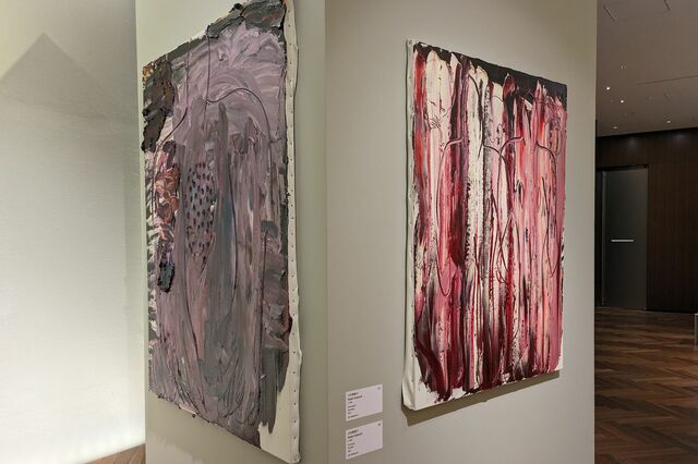 左はO JUNの巨大な作品『ナイトスイミング』(2019)、右は石川順恵『Impermanence 葛』(2020)