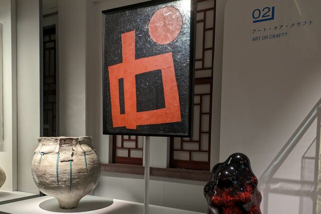 その隣が「アート・オア・クラフト」と題した第2章で、近代日本の美術と工芸の相補的関係、工芸でないものが美術、美術ではないものが工芸と自己規定しあう関係性を前提としたうえで、美術がむしろ工芸的な、工芸がむしろ美術的な要素を取り込んだ作品を展示している。その先駆的作品として山口長男の『丸と四角』が中央にある。