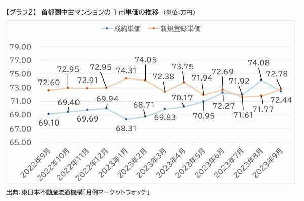 新規登録価格と成約価格の1m2あたりの単価をみると、【グラフ2】のようになっている。通常は、新規登録時の売り出し価格をもとに売り主、買い主が仲介会社を間に挟んで交渉し、多少の値引きのうえで契約が成立する。そのため、新規登録価格より成約価格がやや低くなるのがふつうの状態だ。