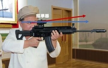 金正恩氏の目線は、赤色矢印方向であり青色の照準線ではない。つまり、金正恩氏は照準器の中を見ていない。