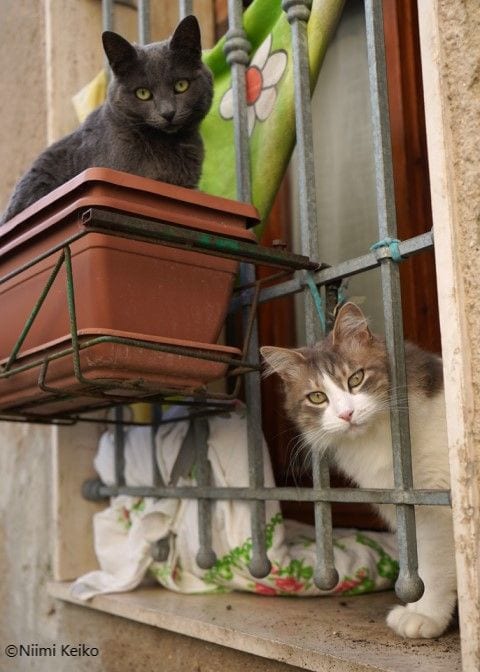 イタリアのサルデーニャ島にある都市サッサリ。窓から外を歩いている猫の様子を見ていた2匹は、「カニースタは、今日はいつもよりもゆっくり歩いているね」と、噂話をしているようでした。名前はムゼタ(手前)とアイシャです。