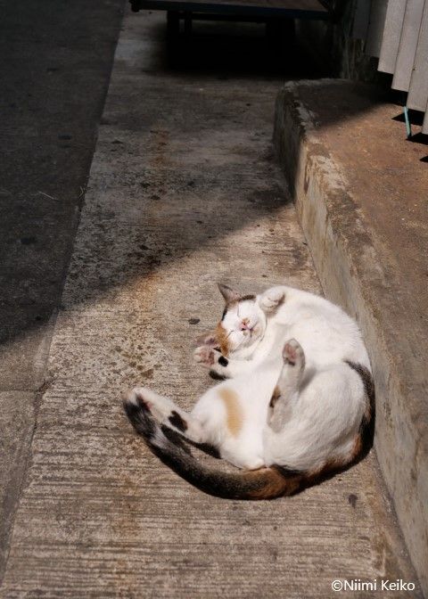 香港の西にある離島、長洲島(チュンチャウとう)にいた猫です。家の前の路地に日の当たる時間は限られているので、日が差した途端に飛び出してきて、ゴロンゴロン。気持ちよさそうな笑顔になっていました。
