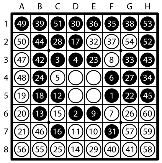 今回の発表によれば、神どうしが対戦し、ともに最善の手のみを打つ場合、このような棋譜となる。番号はそのマスが打たれた順番を示し、コマの色分けはゲーム終了時のもの。(Figure by Hiroki Takizawa, under CC BY 4.0)
