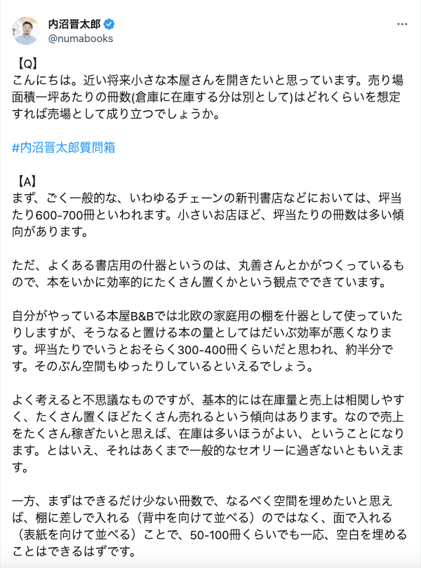 内沼さんのX(旧Twitter)の投稿の一例。「小さな本屋さんを開きたい」という問いに、丁寧に答えている
