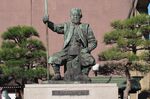 北ノ庄城跡に立つ柴田勝家像。賤ヶ岳から敗走した勝家は、この城でお市の方とともに自害した