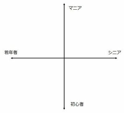 「若い⇔シニア」「ゲームマニア⇔ゲーム初心者」という2つの軸で図を描き、メンバーから挙がってくるターゲットの位置づけを図に書き込んでいくことにしました。