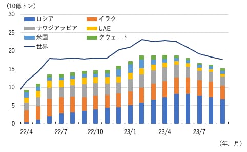 そのインドは、石油製品の元となる原油をロシアから積極的に輸入していることで知られる。インド商工省より同国の輸入統計を確認すると、ロシアがウクライナに軍事侵攻した2022年2月以降、インドはロシア産原油の輸入量を急増させており、直近2023年9月時点では総輸入量の4割弱を占めるに至っている(図表2)。