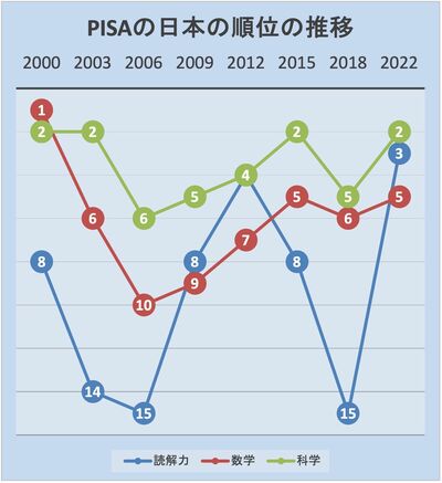 - 経済協力開発機構(OECD)が公表した国際学習到達度調査(PISA)の2022年版で、前回2018年版と比べて「読解力」が15位から3位、「科学的応用力」が5位から2位に上昇した。
