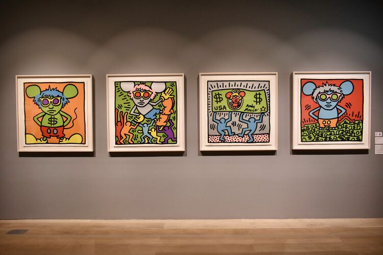 《アンディ・マウス》はキース・へリングが幼少の頃から大好きだったミッキーマウスと、敬愛するアンディ・ウォーホルを融合させたキャラクターが登場する版画作品。へリングとウォーホルは大の仲良しで、一時期へリングはウォーホルの工房に入り浸っていたという。