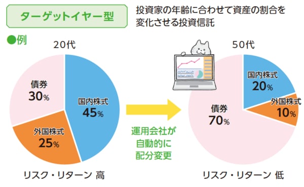 ターゲットイヤー型は、投資信託を保有する人が若いうちは株式の比率を高めて高いリターンを狙い、年齢が上がるにつれて徐々に債券の比率を高めてリスクを減らして堅実にリターンを狙うという風に、資産配分を自動的に変更する運用を行います。