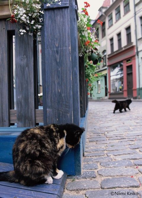 バルト三国の一つ、ラトビアの首都リガに来ました。カジュアルレストランで飼われているこの猫が散歩から戻ってくると、よその黒猫がレストランのテラス席でくつろいでいました。気を使ったのか、気まずかったのか、店に戻らずにそっと様子をうかがっていると、黒猫はその場を離れていきました。