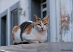 ギリシャのドデカネス諸島のひとつハルキ島で出会った三毛猫です。最初、左側から見たときは、シッポと肩から上だけが三毛模様だったので、白い部分の多い三毛だなと思いました。