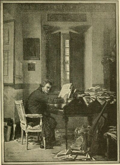 創作活動に没頭するベートーヴェン。コーヒーカップはどこにも置けそうにない