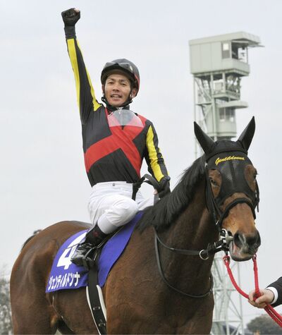 第59回有馬記念(2014年)を制し、ガッツポーズで喜ぶ戸崎圭太騎手とジェンティルドンナ(写真:共同通信社)