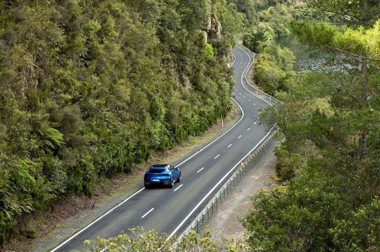 高速道路を下りしばらく走ると、緩やかな緑の稜線を遠方に望む、ニュージーランドならではの雄大な景色が広がった。フロントスクリーン越しに壮観な光景を楽しみながら、右へ左へと続くさまざまな曲率のコーナーを駆け抜けていく。