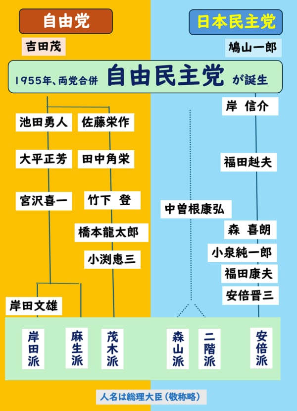 この流れをくむ集団は離合集散やトップ交代を繰り返し、1998年に清和政策研究会となりました。会長の森喜朗氏は2000〜01年に首相を務めます。そして、森氏に続いて小泉純一郎氏、安倍晋三氏、福田康夫氏と4代連続して首相を輩出しました。安倍氏の首相再登板も含めて、この20年余りは清和会支配の時代だったとも言えるでしょう。