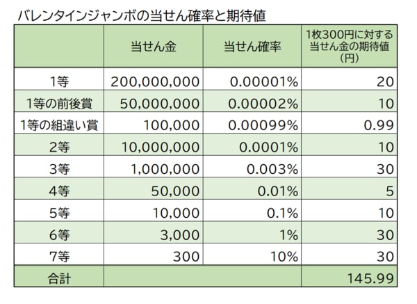 こうして見ていくと、バレンタインジャンボは、「3億円狙いを中心に据えつつ、当せん金100万円以上の高額当せんも狙いたい」という“一攫千金狙い”のくじと位置づけられそうだ。