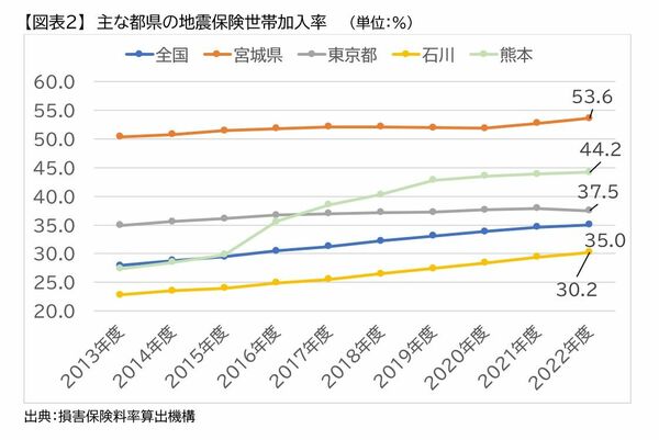 この地震保険世帯加入率を主な都県別に見てみると【図表2】のようになっている。全国平均は35.0%だが、全都道府県のなかで最も高いのは宮城県の53.6%だった。