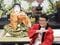 2022年02月、福岡市で開かれた企画展「志村けんの大爆笑展」に展示されたバカ殿様の前で「アイーン」のポーズを取る仲本工事さん(写真:共同通信社)