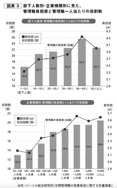 筆者の調査でも、やはり企業規模が増加するにつれ、管理職1人当たりの役割は増加し、それに伴って負担感が上がる傾向がクリアに見られました(図表3・上図)。