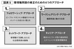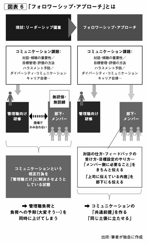 「リーダーシップ偏重」は先進国の多くでも見られ、リーダーシップ研究においてしばしば批判され、その代案として、リーダーについていく側の行動、つまり「フォロワーシップ」への研究がなされてきました。「フォロワーシップ・アプローチ」とはつまり、「脱・リーダーシップ偏重」なのです(図表6)。