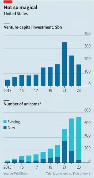 調査会社のピッチブックによれば、ベンチャーキャピタル(VC)会社が米国で昨年実行した投資は1700億ドルにすぎず、2021年の半分にとどまった。