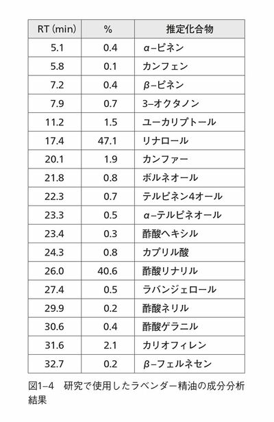 というのも、天然の植物の香りは複数の成分から成り立っているからです。ラベンダーの精油の成分を分析した結果を図1―4に示しています。