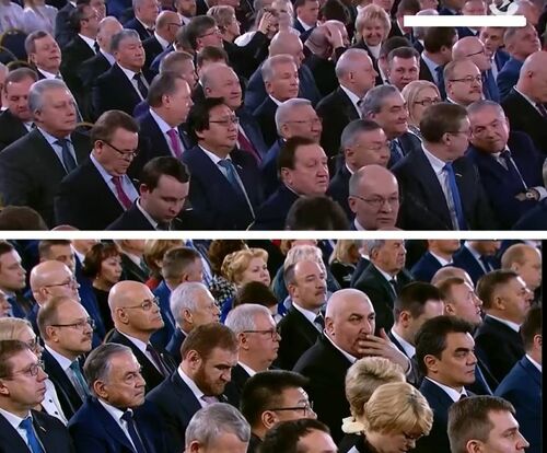 プーチン氏の年次教書を聴講している政権要人や支持者の代表は、どのような気持ちでいるのかを、ロシアが公開した映像で分析したい。