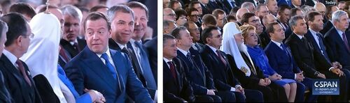ドミトリー・メドベージェフ前大統領は1列目、国防大臣や外務大臣などは2列目である。2018年の年次教書演説とほぼ同じメンバーである。