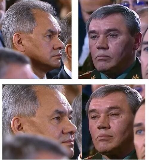 セルゲイ・ショイグ国防大臣、ワレリー・ゲラシモフ軍参謀長も暗い表情だ。