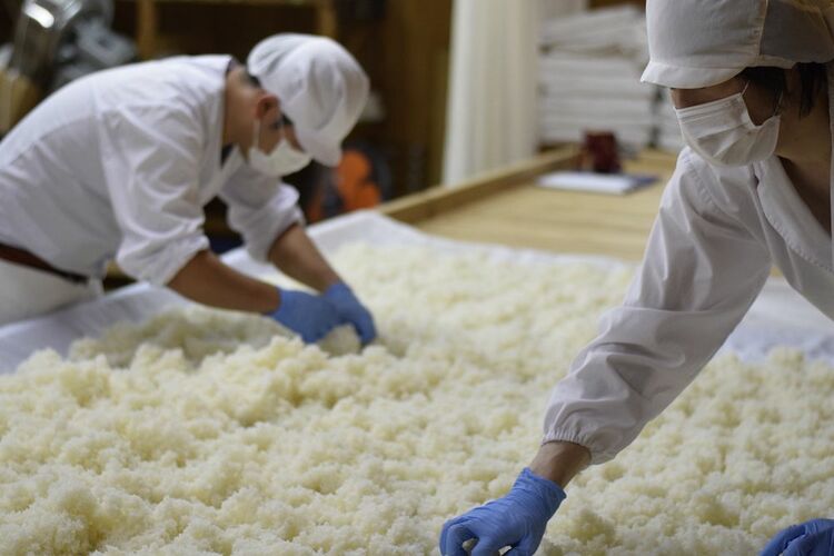 土田酒造では基本的に酒米を使わず、群馬県産の食用米を低精白で使う。「そうすると、麹を強くしなきゃいけない。麹づくりは、蒸した米全体に力強いパワーの遺伝子をもつ種麹をバサッと大量にかけて短時間で仕上げます」と祐士さん。なんと農業用の粉剤散布機(!)で豪快にまき、短時間でたくさんの菌糸に米粒が覆われた“総ハゼ麹”に仕上げる