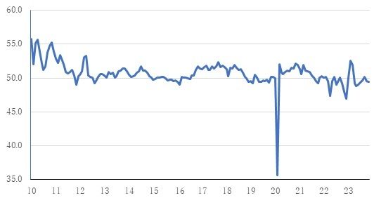 PMI指数は企業の購買担当者に対して景況感に関するアンケートを実施して集計したもので、50を上回ると景気拡大の見方が多いことを示し、50を割ると景気減速の見方が多いことを示す。