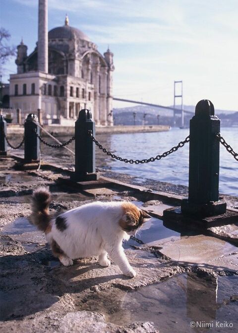 ボスポラス海峡沿いにある町、オルタキョイです。長く降り続いた雨がやっと上がった朝、オルタキョイ広場には水たまりがいくつかできていました。日が差すと、長毛の三毛猫が軽快な足取りで現れ、水たまりに興味津々。水鏡に顔を映して「なんてきれいな猫がいるのでしょう」と、見惚れているようでした。