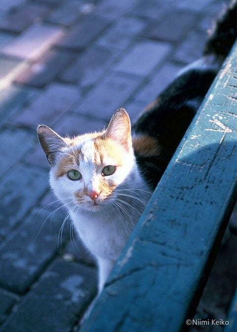 曇っていたときには、ベンチの下で体を寄せ合っていた猫たち。日の光を見た途端に1匹がベンチの下から顔を出しました。