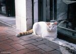 大きな貨物船が通過すると波が立ち、道路まで水が上がることがあります。それで足が濡れたことがあったのでしょうか。「ここなら平気だもん」と、ベンチの上に乗っている猫は賢そうな顔をしていました。