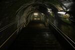 斜坑階段の手すりと壁の間に、用途のわからない斜面がある。運搬用のトロッコが走るような場所だったのか?
