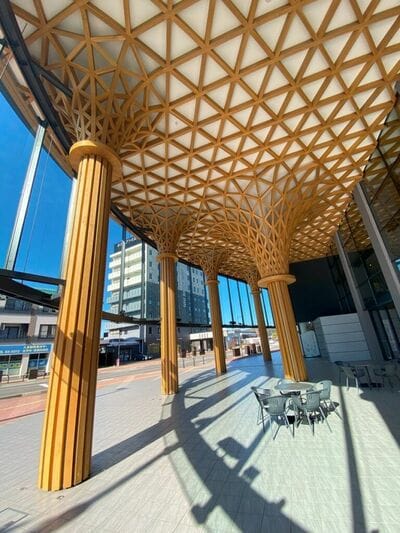 駅前に2023年にできた「アフレア」(JR芦原温泉駅前周辺整備 西口賑わい施設)。坂茂?と思うが、設計は福井市の木下設計。