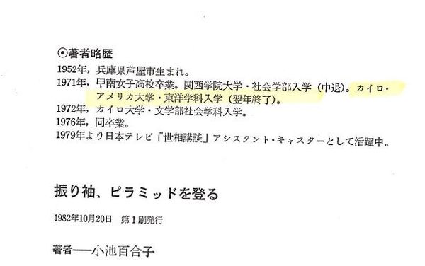 There is another lie. In Koike’s book “Furisode (Japanese Kimono) Climbing the Pyramid" (published 1982) Koike wrote "I entered the Department of Oriental Studies at the American University in Cairo (AUC) in 1971 and completed the course the following year". However, there was no such department in AUC at that time.